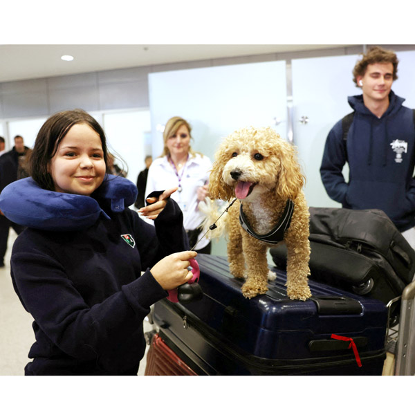 無事にアテネ国際空港に到着し、愛犬と一緒に笑顔を見せる非難してきた乗客(C)ロイター