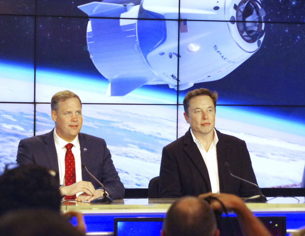 スケールがデカい(イーロン・マスク氏=右とNASAのブライデンスタイン局長)/(C)共同通信社