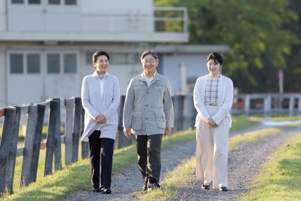 御料牧場内を散策される天皇、皇后両陛下と長女愛子さま=栃木県高根沢町(代表撮影)