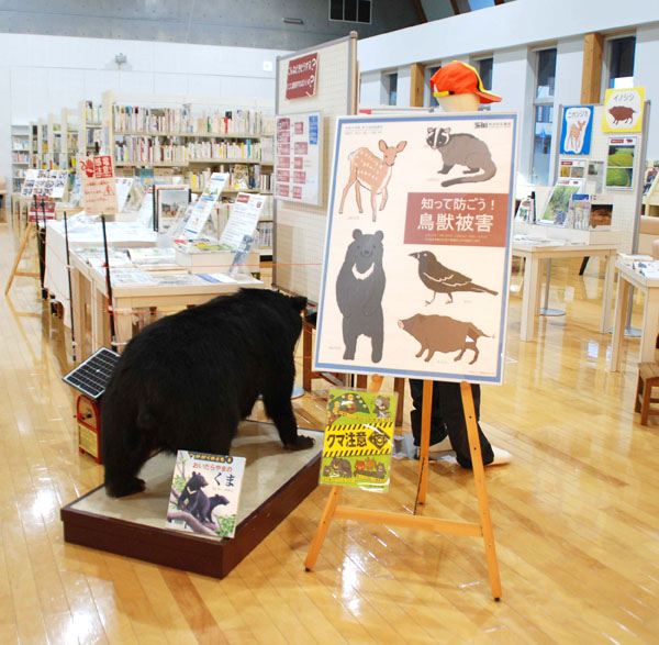 鳥獣被害対策をテーマにした企画展示にはクマの剥製も(提供)紫波町図書館