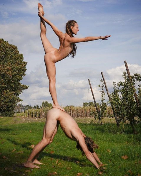 「オシリを解き放て」のポーズをとるシルケ・マイスさん(上)とキーラン・シャノンさん(フェイスブックから)