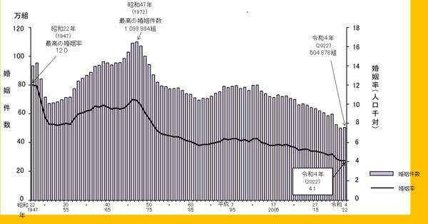 婚姻件数及び離婚率(人口千対)の年次推移(C)日刊ゲンダイ