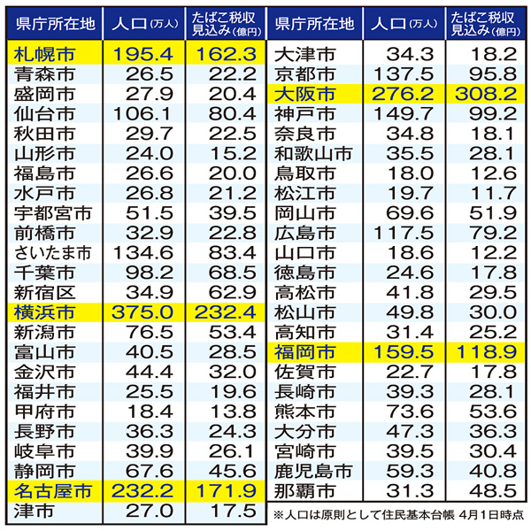 地方自治体とたばこ税収(上)47都道府県 県庁所在地のたばこ税収一覧