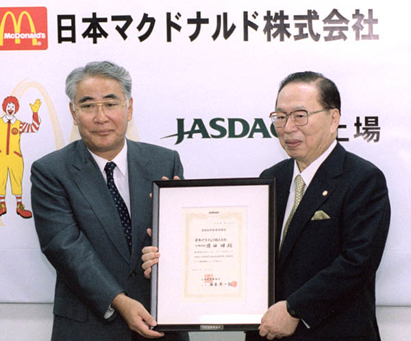 株式を上場し登録証を受け取る藤田田社長(右・2001年当時)/(C)共同通信杯