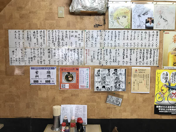 ラーメン以外にもズラリと並ぶメニュー。平松伸二さんの色紙も(提供)藤原亮司