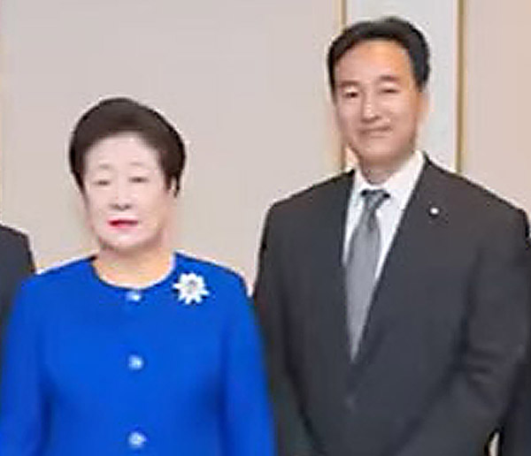 新たな“証拠写真”が…(山際大志郎経済再生相と韓鶴子総裁=旧統一教会のピーステレビから)