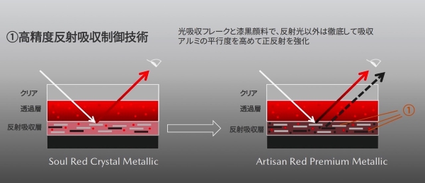 右が匠塗「アーティザンレッド」のメカニズム(提供)マツダ