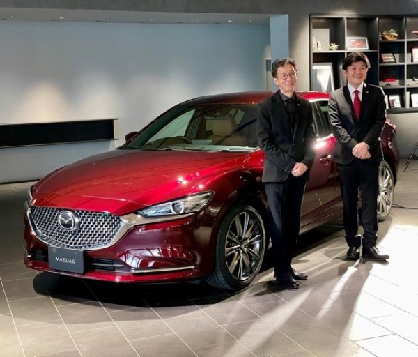 マツダ6の20周年記念車と塗装技術Gr.マネージャーの河瀬英一氏(右)と、デザイン本部・岡本圭一氏(写真)小沢コージ