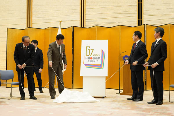 レガシーにしたい岸田首相だが…(右2、G7広島サミットのロゴマーク決定発表で)/(C)共同通信社