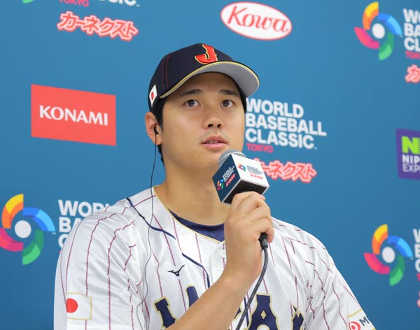 侍ジャパンを支えるパートナーのロゴの露出は増えそう(練習後に行われた会見での大谷翔平)/(C)日刊ゲンダイ