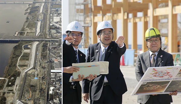 何もかも万博名目で費用は10兆円越えに!?(環境改善目指すと夢洲を視察する斉藤鉄夫国交相=右2、左は“万博道路”といわれる高速道路「淀川左岸線」の工事)/(C)共同通信社