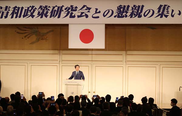 2022年「清和政策研究会」のパーティー(壇上であいさつする安倍元首相)/(C)日刊ゲンダイ
