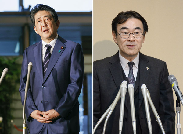 黒川弘務東京高検検事長(右) の定年延長で、勝手な法解釈変更で検察庁法改正まで強行しようと…(黒川氏の問題で、会見する安倍首相=左、当時)/(C)共同通信社