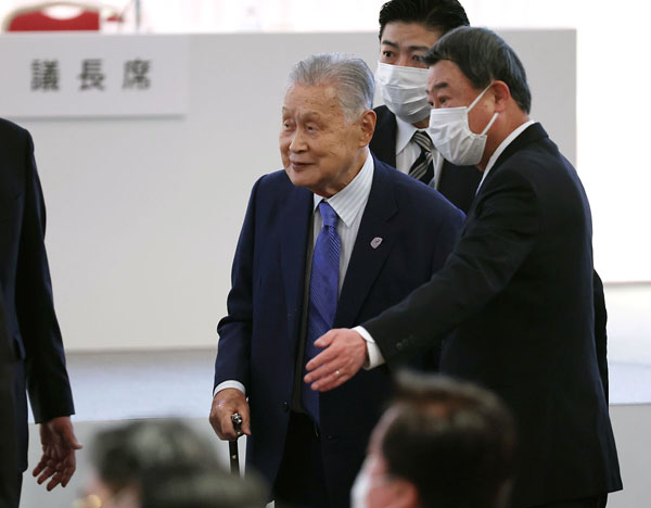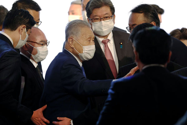 同大会で、あいさつに駆け寄る議員たちに声を掛ける森元首相(中央左)と寄り添う萩生田光一政調会長(隣り)/(C)JMPA
