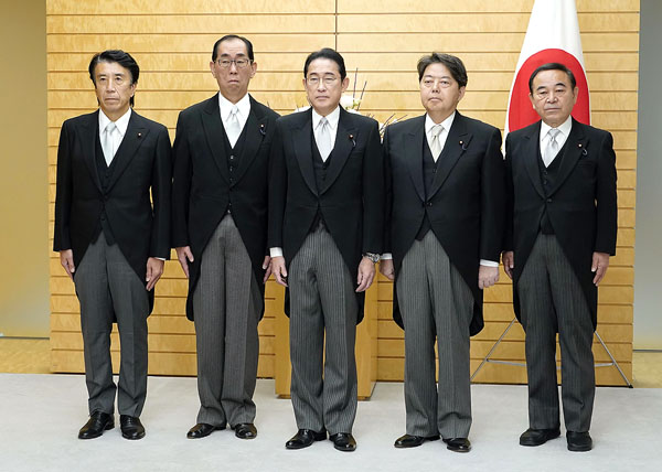 (左から)斎藤健経産相、松本剛明総務相、岸田首相、林芳正官房長官、坂本哲志農相(C)共同通信社