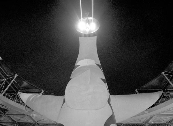 「黄金の顔」の両眼から強力な光線を夜空に向け照射する「太陽の塔」/(C)共同通信社