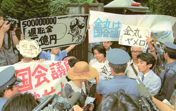 議員辞職などを求め、金丸信・前自民党副総裁邸前で横断幕やプラカードを持って抗議する市民グループ(C)共同通信社