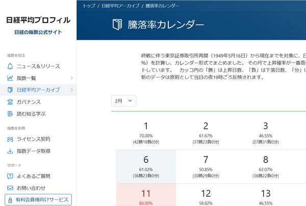 日経平均騰落率カレンダー(日経の指数公式サイトから)