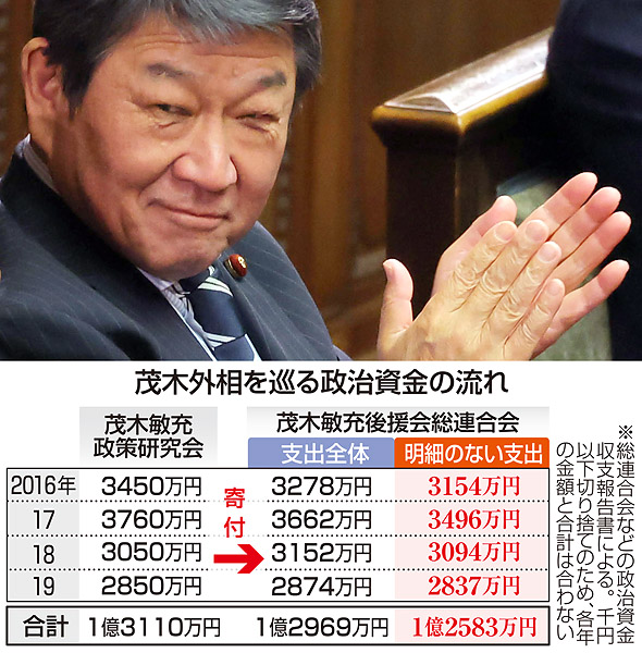 外相時代も1億2千万円の使途不明金(下表は、2020年に発覚した茂木外相を巡る政治資金の流れ=共同)/(C)日刊ゲンダイ