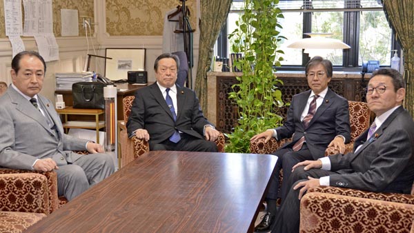 政倫審開催へ向け協議する自民党の浜田靖一国対委員長(中央左)と立憲民主党の安住淳国対委員長(同右)ら(C)共同通信社