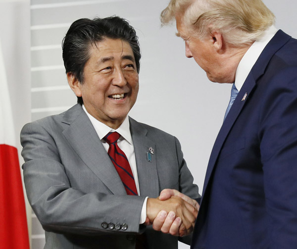 米国の圧力に屈し、たった3回の議論で、「届け出」だけで容認できる「機能性表示食品」に(日米首脳会談でトランプ米大統領と握手する安倍首相=当時)/(C)共同通信社