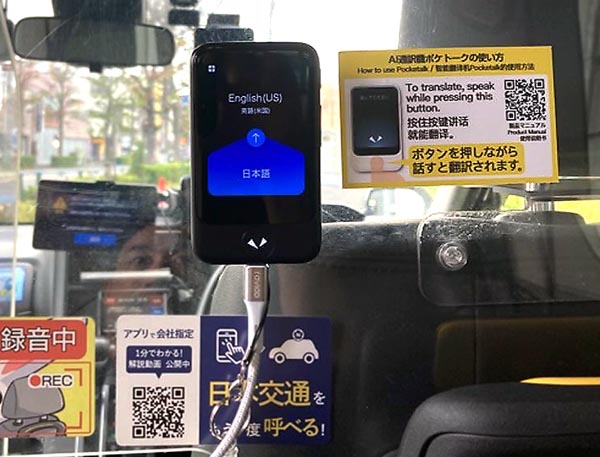 タクシーに搭載されたAI翻訳機「ポケトーク」/(提供)ポケトーク