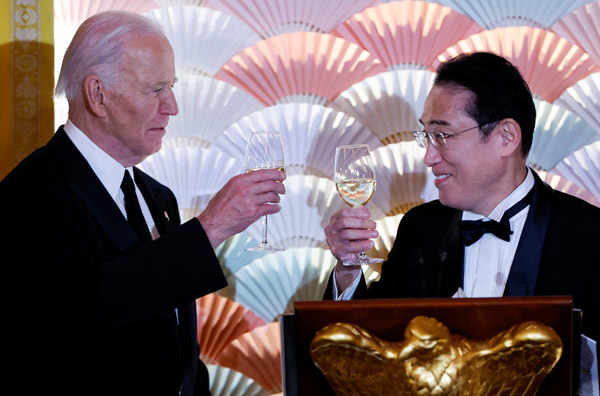 空前の朝貢外交を展開中(バイデン米大統領と乾杯する岸田首相=米公式夕食会で)/(C)ロイター