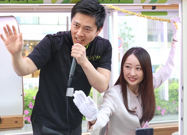 汗かいてますアピール(衆院東京15区補選、「日本維新の会」新人候補応援に駆け付けた吉村洋文大阪府知事=14日)/(C)日刊ゲンダイ