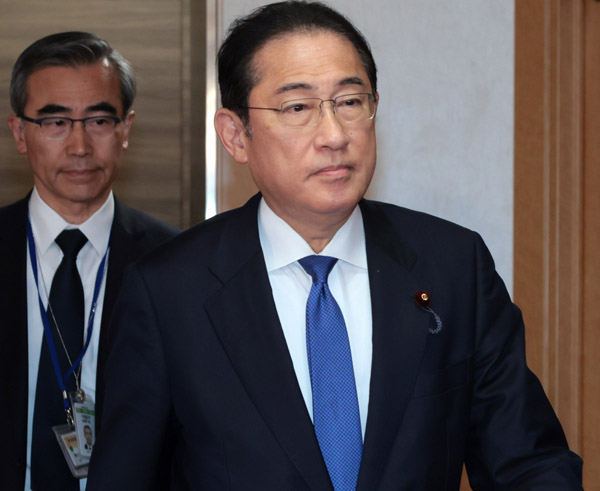 四面楚歌(麻生副総裁、茂木幹事長らとの三者会談のために党本部に入る岸田首相=8日)/(C)日刊ゲンダイ