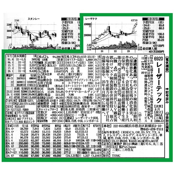 誌面の上部に株価チャートと予想PERが掲示。レーザーテックに記者がつけた見出しは【独占】!(「会社四季報」2024年春号から)