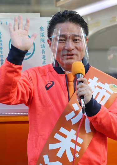 2021年におこなわれた衆議院選挙でフェイスガードを着用して演説する柿沢未途候補(C)日刊ゲンダイ