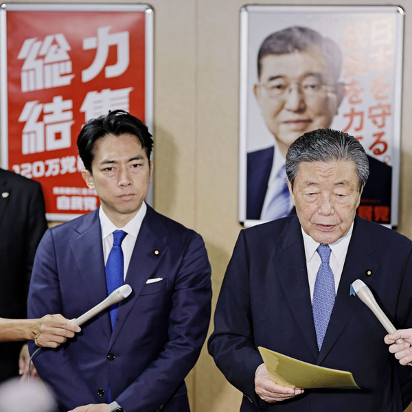 所詮は裏金疑惑解明よりも選挙が最優先(選対本部会議後の森山幹事長と小泉選対委員長)/(C)共同通信社