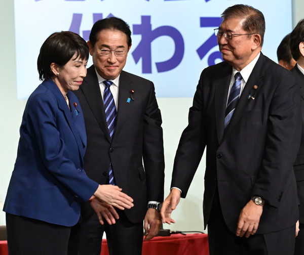 「総裁選挙2024」後に開かれた自民党両院議員総会。健闘をたたえ合い互いに握手に歩み寄る石破茂新総裁(右)と高市早苗氏(左、中央は岸田首相)/(C)JM PA