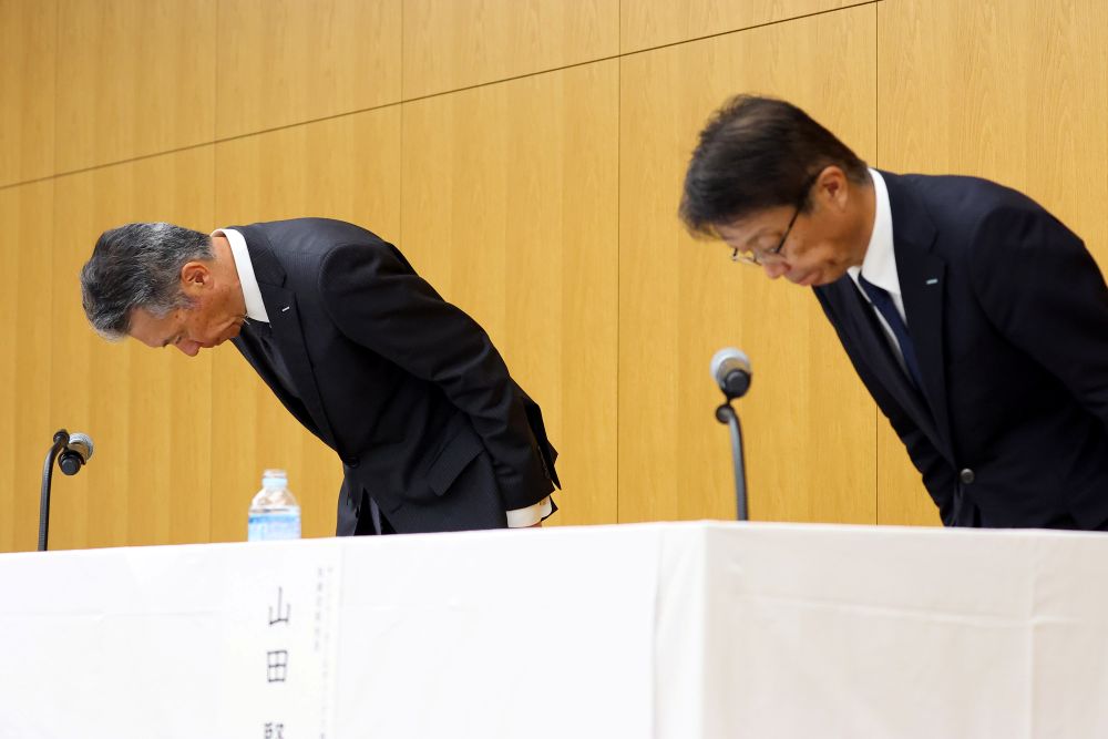 新浪剛史会長の辞任を発表したサントリーの鳥井信宏社長(左)と山田賢治副社長(C)日刊ゲンダイ