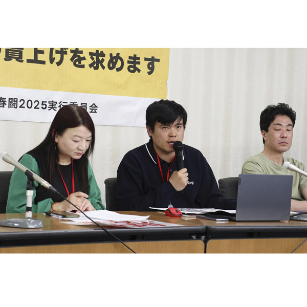 非正規雇用者の給与は「格差顕著に」、と会見する首都圏青年ユニオンの尾林哲矢執行委員長(中央)ら(C)共同通信社