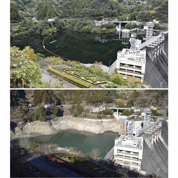 記録的少雨で太平洋側が渇水、貯水率100%(上、2025年)と2月4日、貯水率が低下した大渡ダム=高知県仁淀川町(大渡ダム管理所提供)