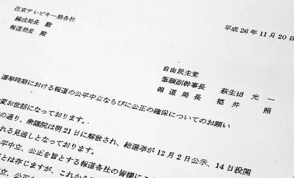 選挙報道に露骨な注文…安倍自民党がテレビ局に“圧力文書”