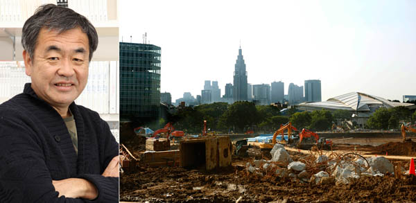 本命視されている隈研吾氏(左)と新国立予定地(C)日刊ゲンダイ
