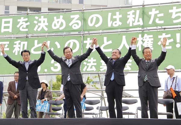 野党共闘の威力(左から民進党・岡田代表、共産党・志位委員長、社民党・吉田党首、生活の党・小澤代表)/(C)日刊ゲンダイ
