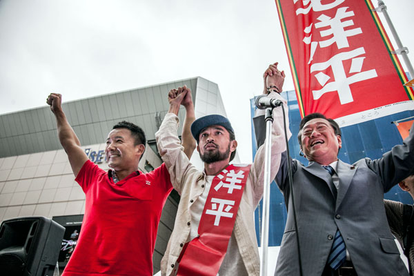 小沢一郎氏も応援(左は山本太郎氏)/(三宅洋平事務所提供)