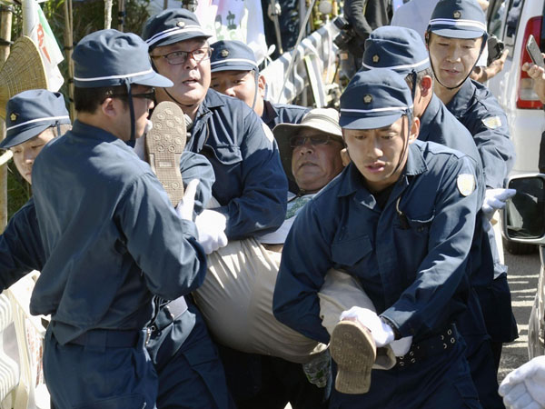 ヘリパッド建設に反対し座り込みをしていた男性を排除する機動隊員ら(C)共同通信社