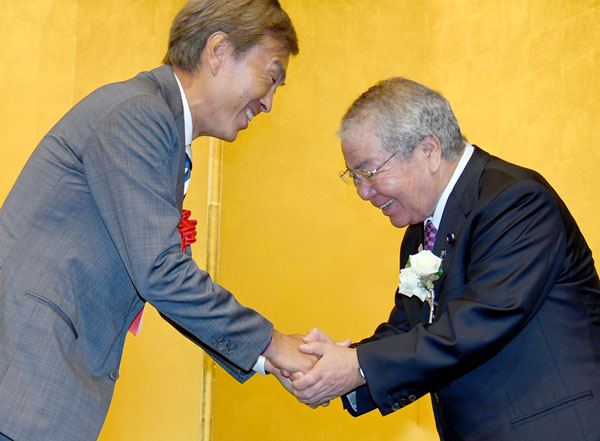パーティーで石原経済再生相と握手をする内田茂都議(C)日刊ゲンダイ