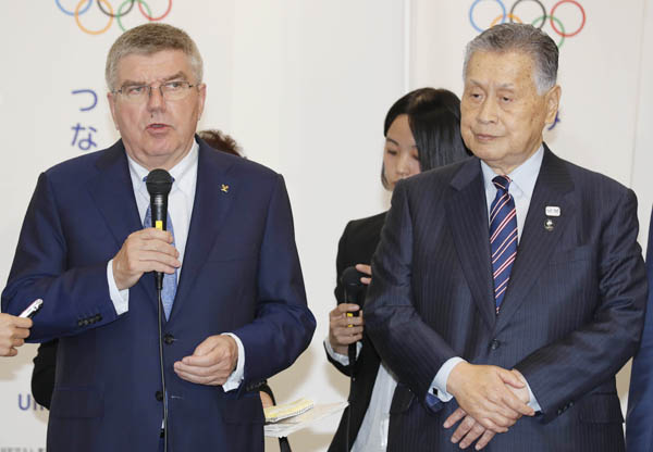 森会長(右)もいよいよ白旗か(左はIOCバッハ会長)/(C)日刊ゲンダイ