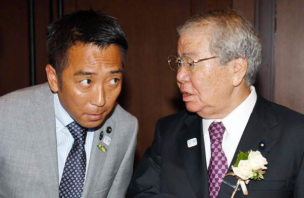 ドン内田都議(右)のパーティーで司会を務めた山崎一輝都議/(C)日刊ゲンダイ