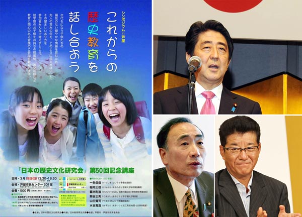 19日に行われるシンポジウムのチラシ(右は、安倍首相、松井大阪府知事、籠池理事長=共同)/(C)日刊ゲンダイ