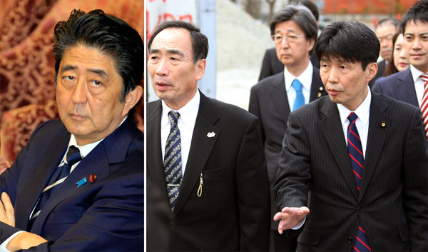 安倍首相(左)と議員視察団に説明する籠池理事長(C)日刊ゲンダイ