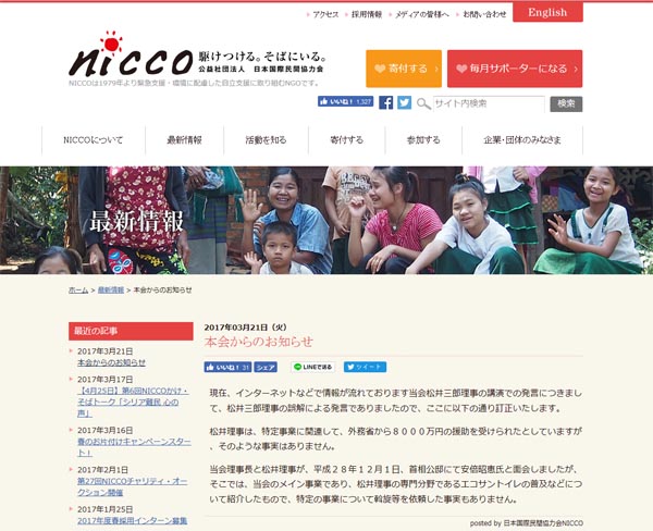 松井氏の発言を訂正(日本国際民間協力会HPから)