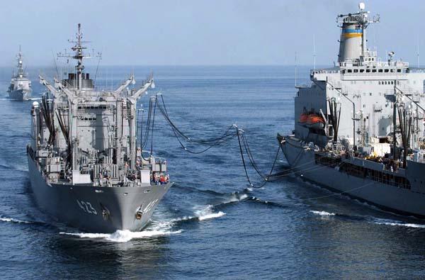 03年、テロ特措法に基づき米艦船(右)に洋上給油する海上自衛隊の補給艦「ときわ」(C)共同通信社