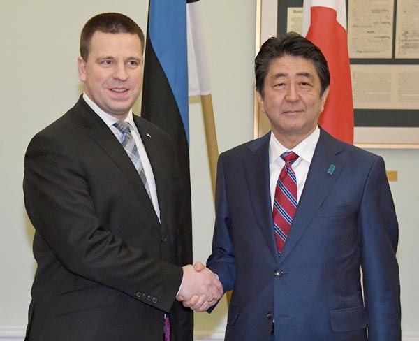 エストニアのラタス首相(左)と握手する安倍首相(C)共同通信社