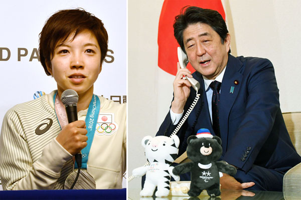 小平選手(左)を電話で祝福する安倍首相/(C)共同通信社